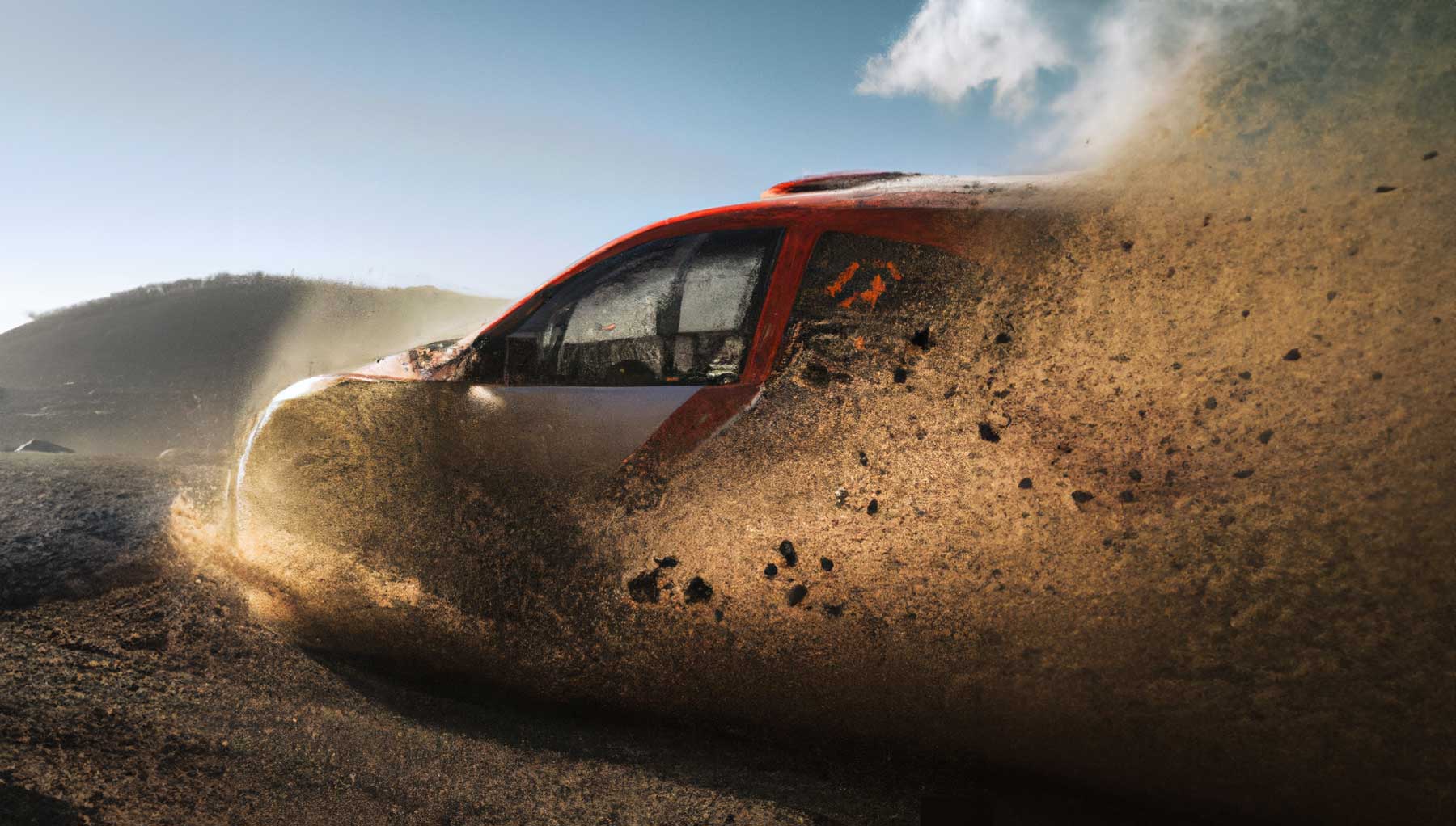 Each one has its strengths, but some are better than others. We’ll use the same prompt to showcase the difference between platforms: a photograph of a dirt rally race car covered in dirt, moving at a fast speed, dirt flying, mountain scene, award-winning photography, soft shadows, and cinematic lighting.