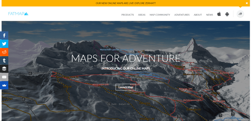 Fat Map displays a full-screen image with CTA in an overlay. A top message bar uses an arrow to point to a link in the menu. Scrolling shows a download CTA, large clean sections highlighting maps, an information section with short text and an image, media logos, image and text links to locations, a signup form over multiple images, and links to maps. The posts for each location uses full-screen images with text and 360 degree video to display the 3D maps. The site uses dark gray and white backgrounds and keeps the page clean.