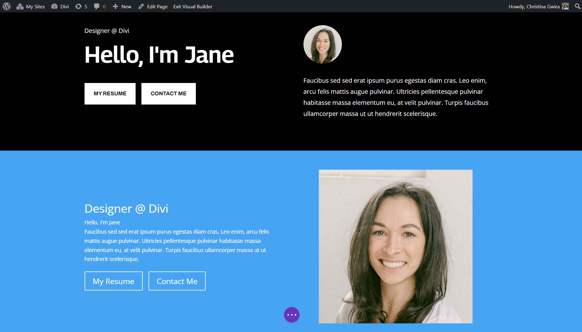 The positioning of modules and elements will be different; however, all the pieces โ the text, title, subtitle, image, and body text are present. What used more than 5 modules can be accomplished with one, and still have the Divi buttons side by side.
