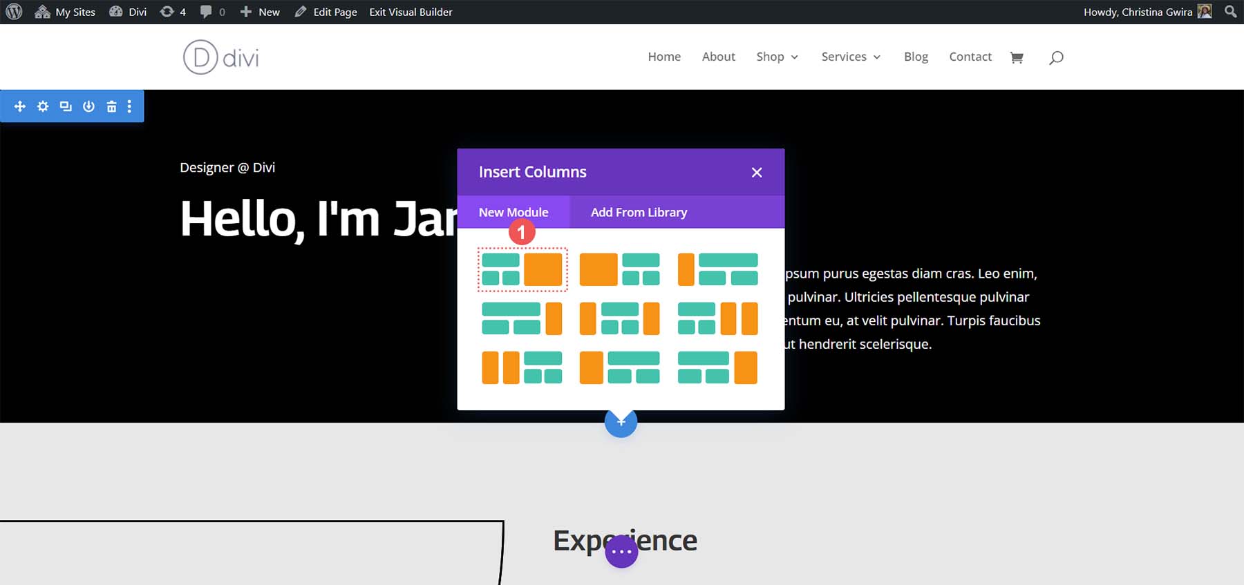 Similar to our previous method, weโll need to adjust our section. In this case, weโll use a regular Divi section instead of a specialty section. To begin, we click the orange plus icon and select the blue regular section icon.