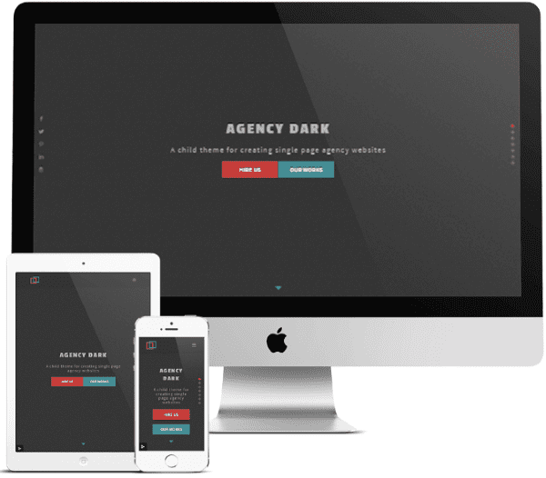 Agency Dark is a one-page child theme with a custom portfolio section to show off your work in a tiled gallery section. Image open in a lightbox. Use the custom testimonies section to show what others are saying about your work. It also includes a custom contact form and a custom call-to-action button in the menu. It provides new customizer settings for the menu call-to-action button, footer, and back to top button. It’s a good choice for any type of single-page portfolio.
