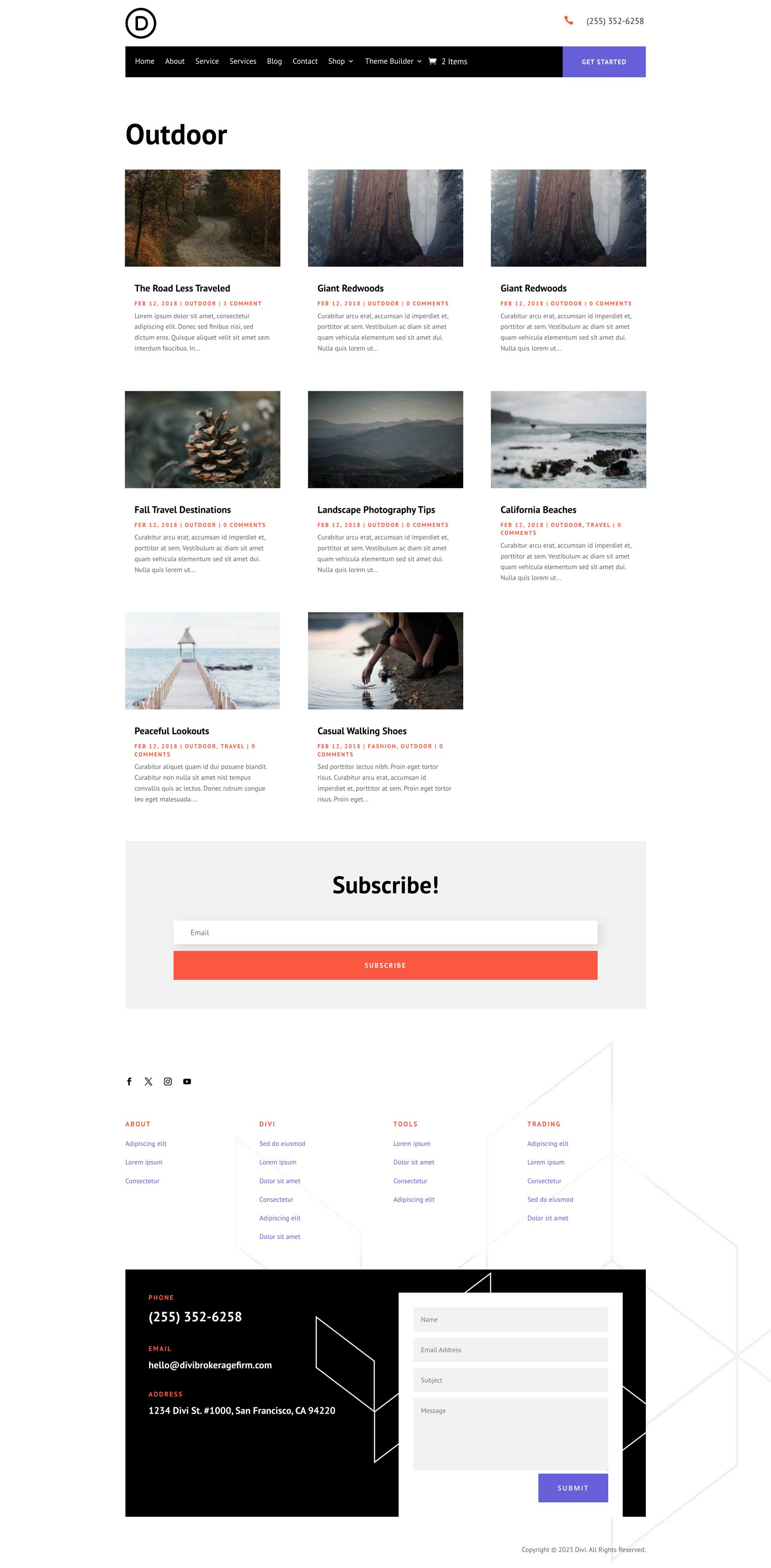 – 10 Premade templates for the matching Brokerage Firm Layout Pack for Divi (including ecommerce, header, footer, and category designs)