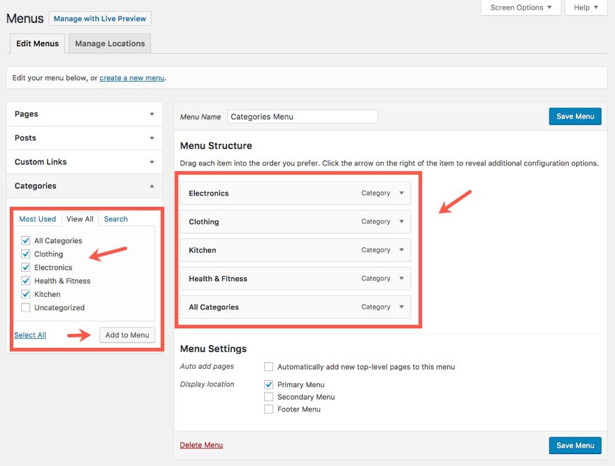 Go back and toggle open the categories box and select the same four categories (Electronics, Clothing, Kitchen, and Health & Fitness) and add them to the menu. Then drag each of the categories you just added one level under the “All Categories” mega menu item.
