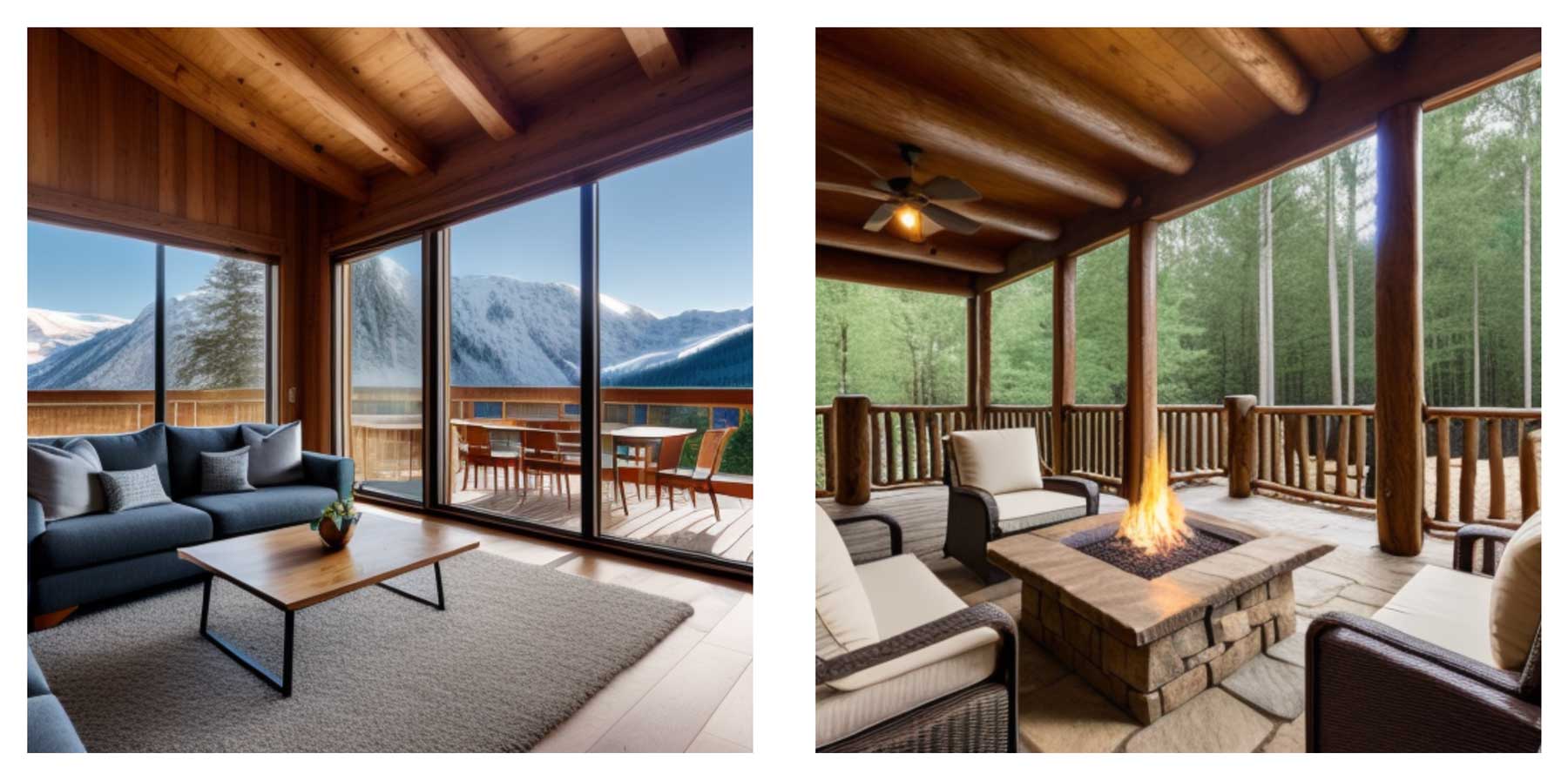 Image 1 Prompt: Modern interior design, chalet, living room, wide windows with a view, mountains, wood floor, modern furniture.