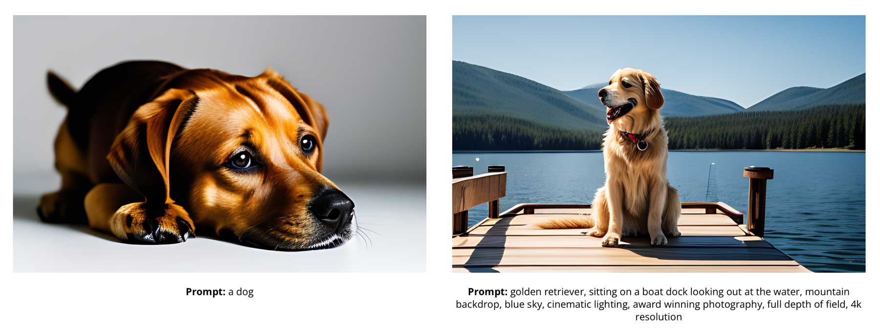 For example, using the prompt a dog will produce good results but will likely be devoid of other elements in the photo. Alternatively, using the prompt golden retriever, sitting on a boat dock looking out at the water, mountain backdrop, blue sky, cinematic lighting, award-winning photography, full depth of field, 4k resolution gives Divi AI plenty of information to create a complete scene.