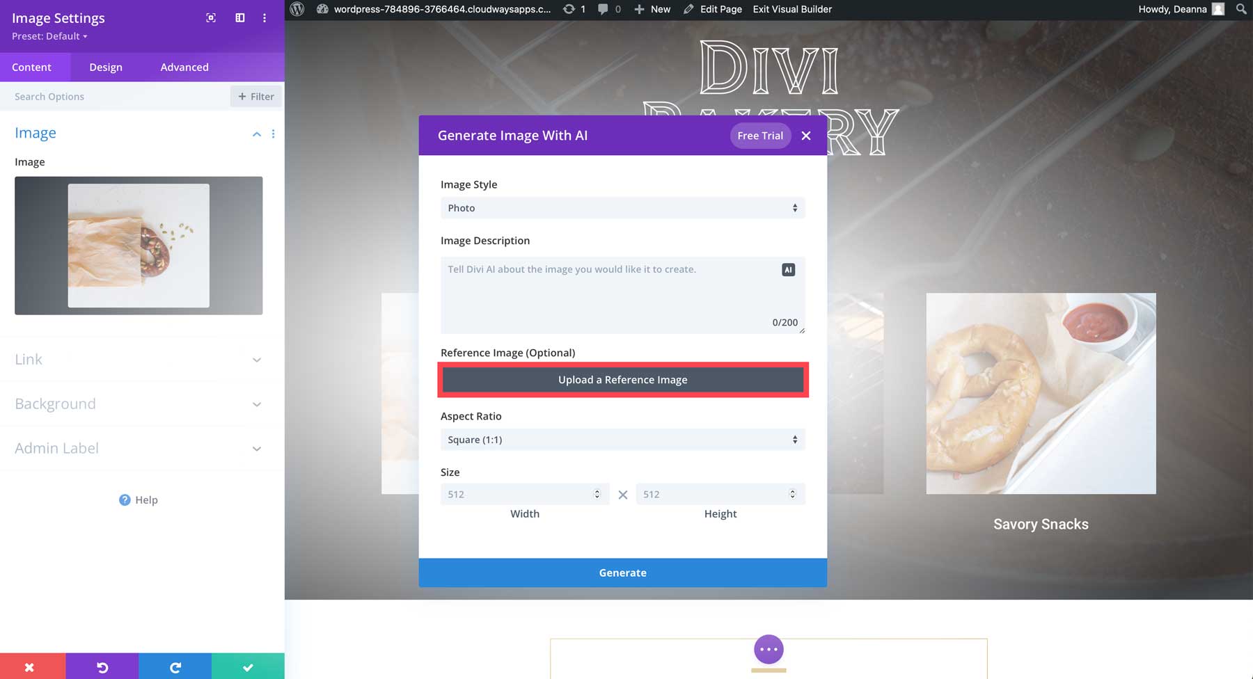 One of the most impressive features of Divi AI is how easily you can generate images. There are several ways to create images, including refining and modifying existing images and automatic image generation. Let’s briefly walk through the steps to create an image with Divi AI. To make things easier, we’ll start with the Bake Shop Layout Pack for Divi, but you can follow along with the layout of your choice.