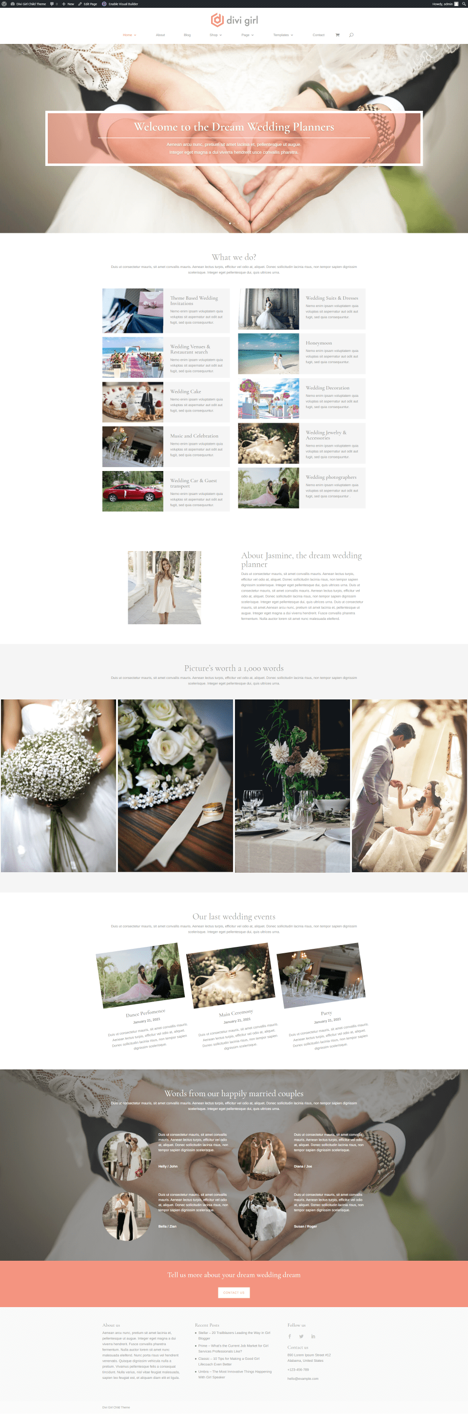 The Divi Girl child theme includes 12 homepages to choose from. Each has peach colors and elegant fonts to attract the preferred audience.