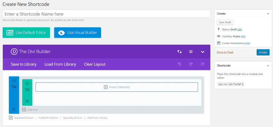 This takes you to an editor where you can choose to build with the Divi Builder. The shortcode is provided on the right. You can copy and paste this into the content of another module. Simply create a layout using the Divi Builder and click Create to save it.