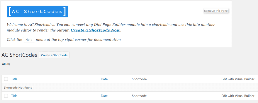 A new menu item is added to the Divi menu in the dashboard (go to Dashboard, Divi, AC Shortcodes). Clicking this will open the AC Shortcodes menu where you can create shortcodes. Any shortcodes that you’ve created will display here in the list. To create a new shortcode, click Create a Shortcode.