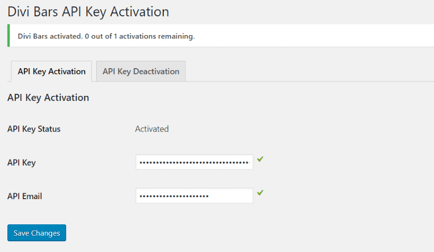 Enter your API key and email, and save changes. You’ll see a message at the top that shows how many activations you have left (this will vary depending on the license you purchase).