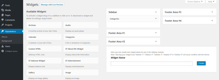 Clients have access to posts, media, pages, comments, projects, appearance (which only includes menus and background), and users. All of the themes, plugins, widgets, and Divi menus are hidden. Clients will not see update notifications for them or the WordPress core.