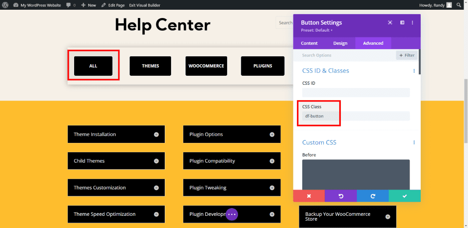 I’ve added a new button that will turn the filter off and display all categories. For this, I’ve added the button class to the CSS Class field, but I did not include a category class. Without the category specified, the button will trigger all categories.
