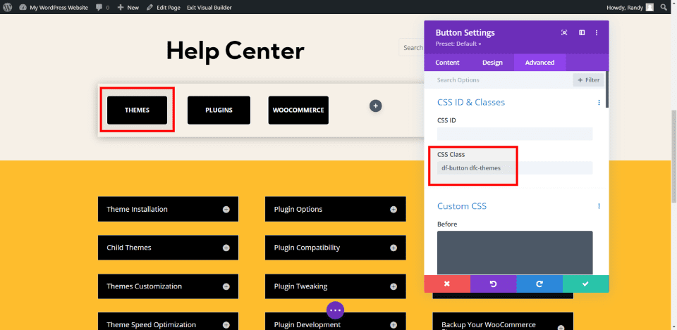 For my first example, I’ve created articles for a help center using the contact page from the Meal Kit layout. Buttons are used for the filter and toggles are used for the information. The toggles can include any type of content such as written tutorials, videos, etc. I’ve added the button class to the Advanced tab. I’ve also added a class with the category. In this case, the category is Themes.