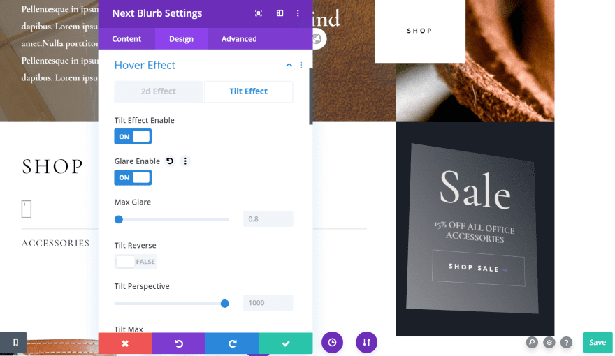 The tilt effect includes glare options, a reverse option, perspective, speed, starting and ending points, etc. This example shows the standard tilt option with glare enabled. I’ve left the settings at default.