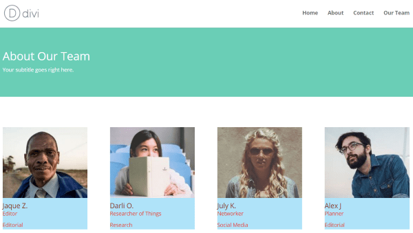 This page showcases the team members for a single department. It’s built with several image and text modules.