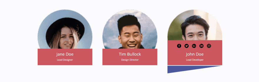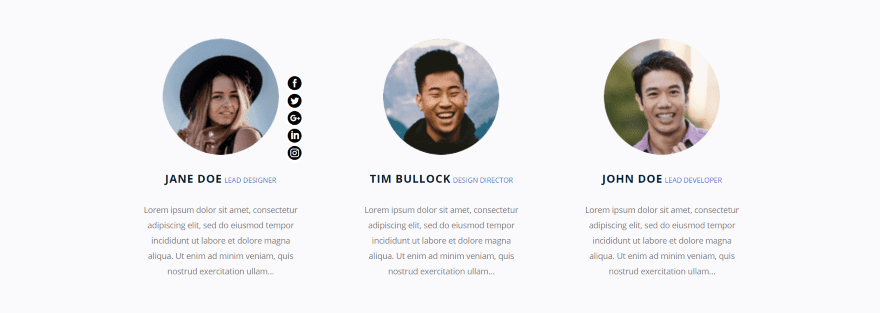Hereβs the same module using Style17 and Random for the team member selection. Iβm hovering over the middle team member, which displays the social icons in an overlay. The colors are default.