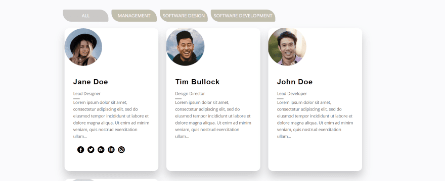 Hereβs Team Members Grid with layout Style19 and filter button style 5. Iβve changed the button colors and added a background shadow to the cards to match. In this example Iβm hovering over Visual Media in the filter to show the button animation.