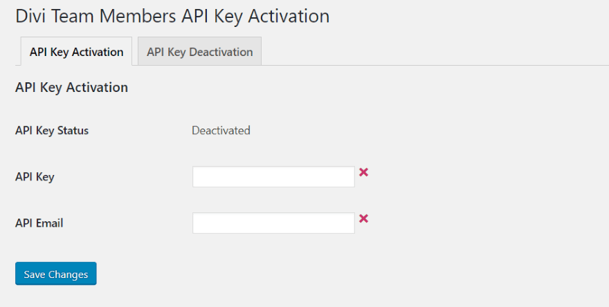 Once you upload and activate the Divi Team Members plugin youβll need to activate the license. In the dashboard, go to Settings > Divi Team Members, and enter your API key and email.