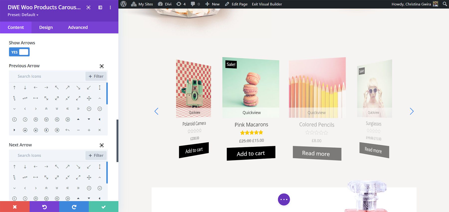 Divi WooCommerce Extended Products Carousel presents the WooCommerce products within a slider. It includes the same settings as the WCE Products Module and adds those for the carousel. You can select the product type, layout, number to display, the sorting order, hide products out of stock, choose categories, etc.
