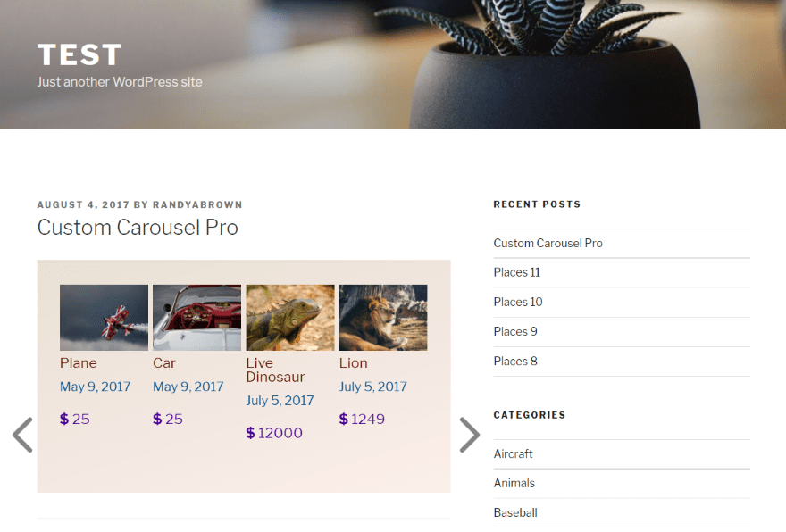 I now have a product carousel that shows off the WooCommerce categories that I selected. I selected to show 4 posts, increased the image size, changed the font colors for the title, meta, and custom fields, and increased the font sizes for the title and custom fields. In this example Iβm only showing the date for meta, but just like regular posts I could show any of the meta information and an excerpt.