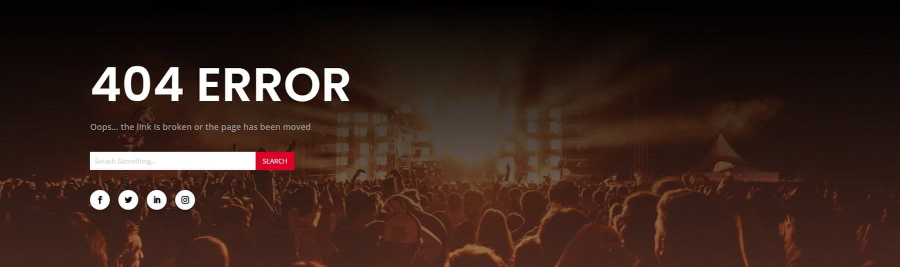 The example uses a background image of an event, which works great with the Divi Concert landing page. It includes a full-width background image, the 404 error message, a search box, and social icons.