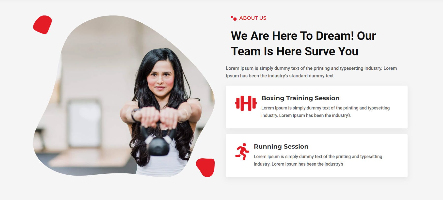 This is About Us layout 4 from the fitness gym webkit. It features an image clipped into a shape on the left and some text and blurb modules on the right.