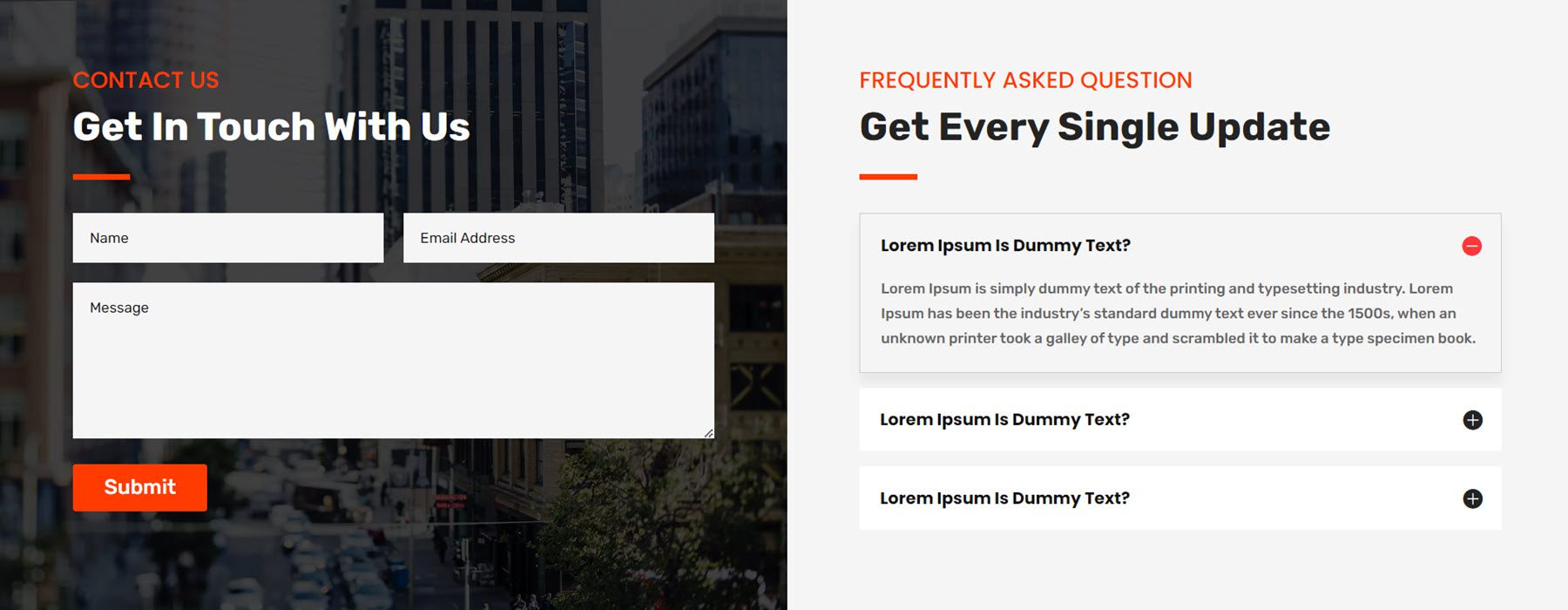 The first contact form/info layout comes from the finance and consulting webkit. This is contact/info style 1, featuring a contact form on the left on an image background and a FAQ section on the right.