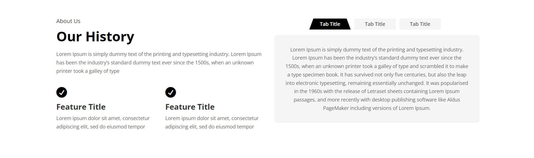 For the last tab section, we’ll take a look at Style 12. It has some text on the left, along with two blurbs with icons to highlight features. The tab module is on the right, with a grey background. When selected, the title container has angled edges and a black background.