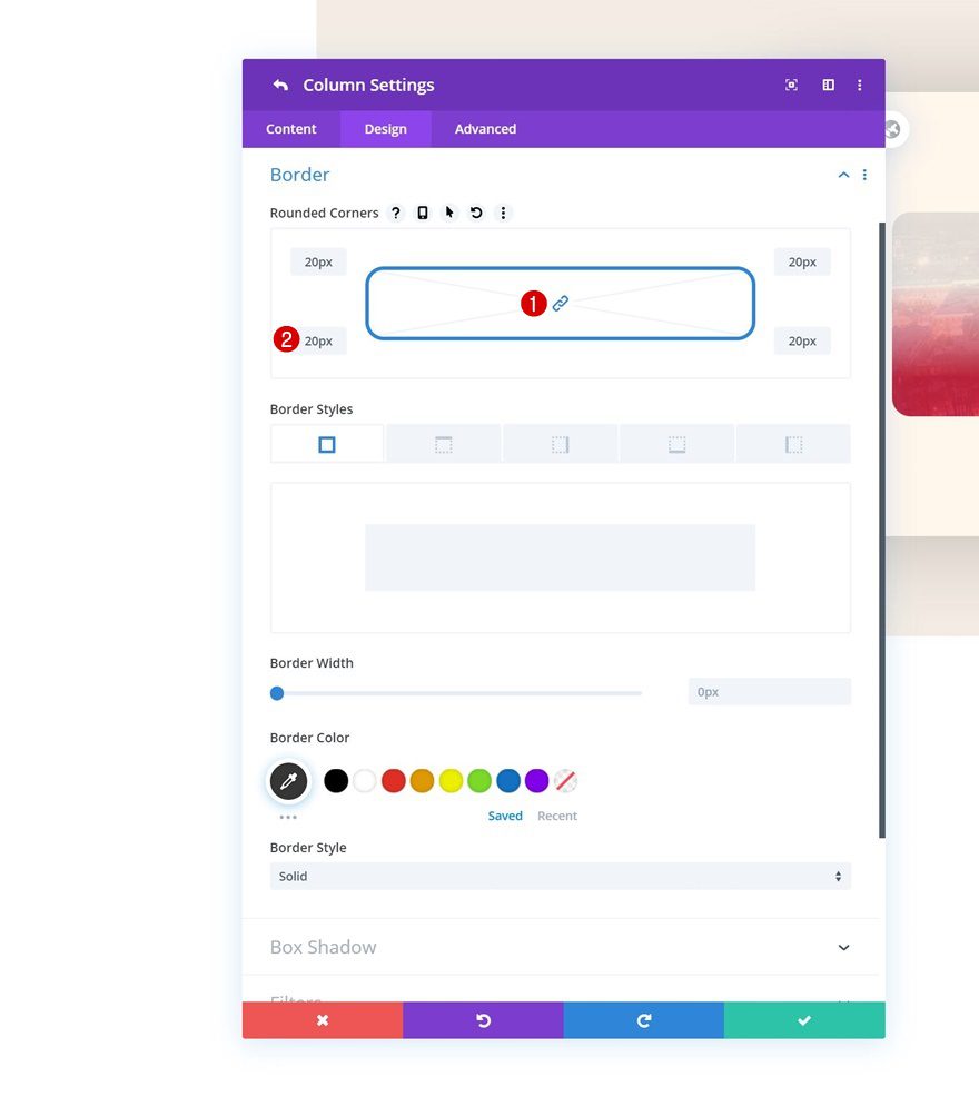 Continue by adding β20pxβ border radius to each one of the corners in the border settings.