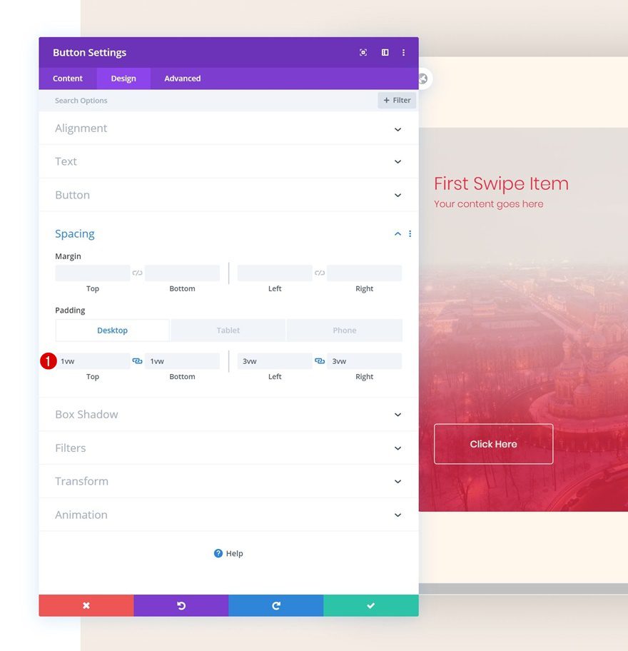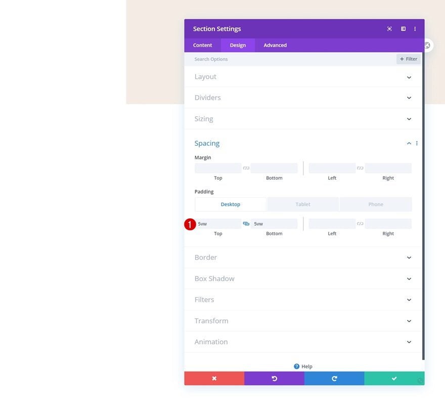 Move on to the design tab and add some custom padding values across different screen sizes.