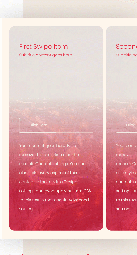 Once youβve completed the first column and all the modules in it, you can clone the entire column up to 5 times, depending on how many column swipe CTA cards you want to display. Make sure you change all the copy for each column duplicate along with the button links.