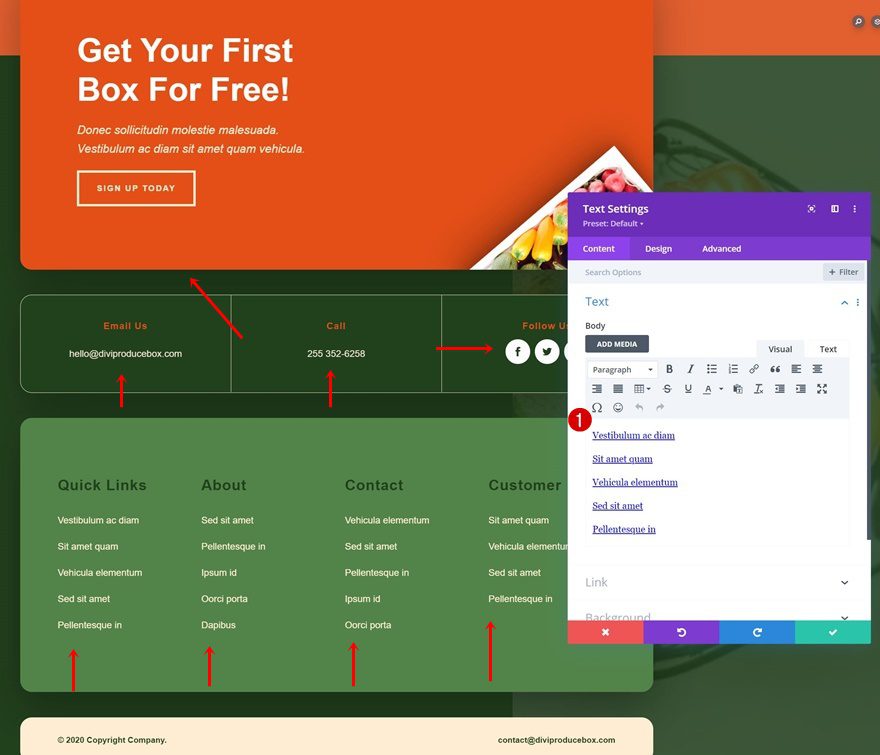 And complete the footer design by changing the copy inside the Text Modules which you can find in the section’s last row.