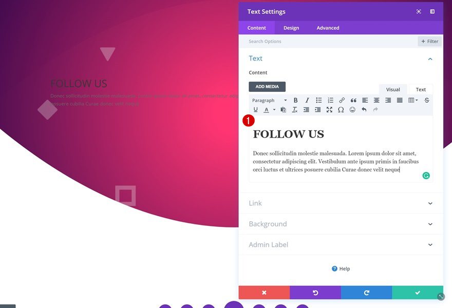 The only module weβll need in this row is a Text Module. Add a heading and a paragraph to the content box.