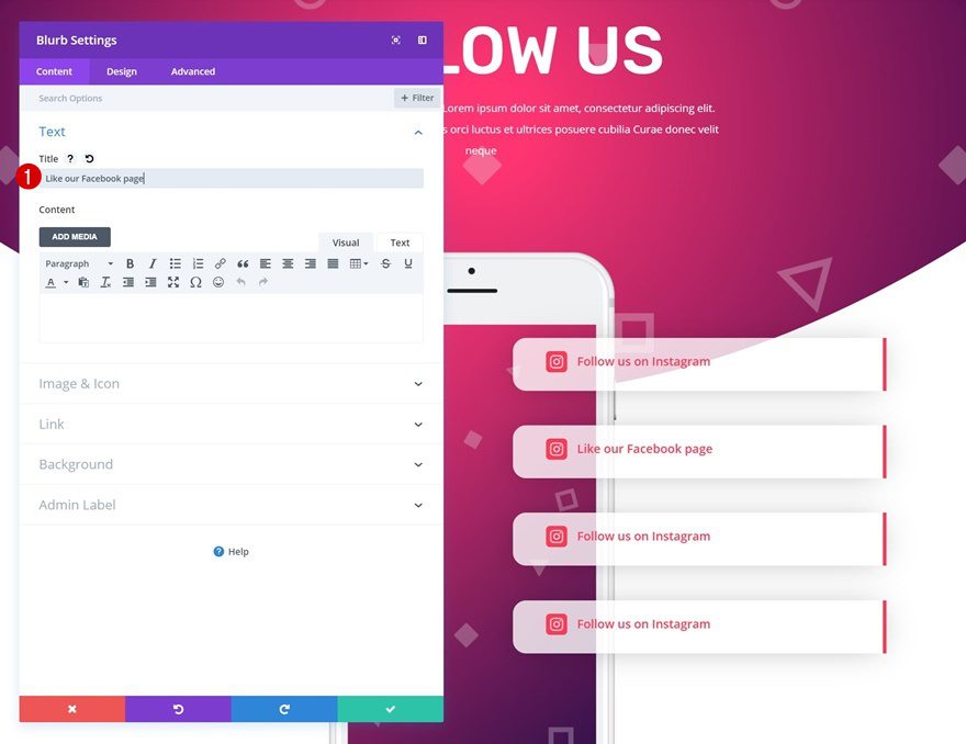 We can now add all the social networks! To create them, weβre using Blurb Modules. Go ahead and add the first Blurb Module to the third column and change the content.