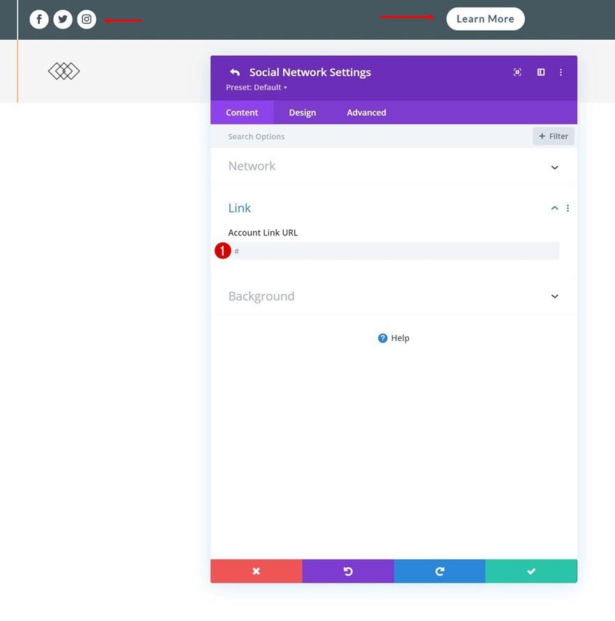 Next, add relevant links to the Button Module and each one of the social networks inside the Social Media Follow Module.