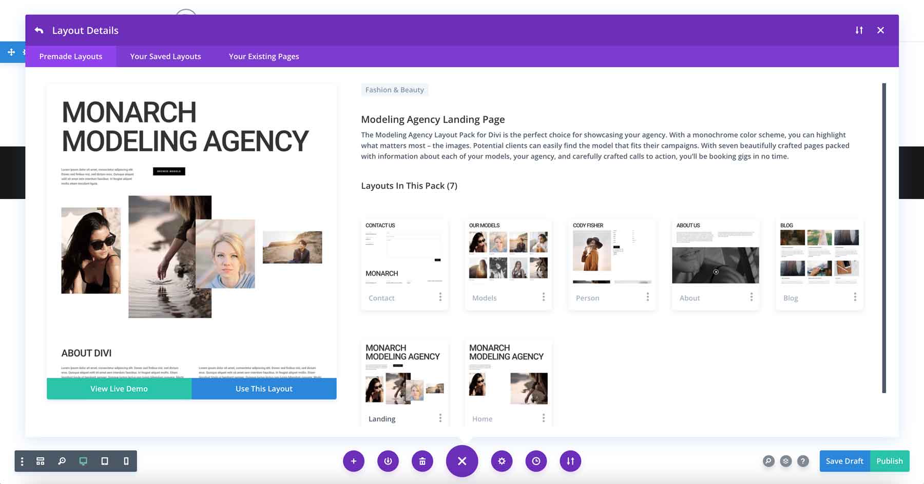To access your new layout, simply activate the Visual Builder when editing a page and look for the “Load From Library” icon in the page settings bar (it looks like a plus symbol). Click this icon to launch the Load From Library popup. Under the Premade Layouts tab, you can easily find the new layout by scrolling through the list of layout packs. Once you find the Modeling Agency Layout Pack, click on it. You will see all the individual layouts included in the pack. Select the layout you want to use and then click the “Use This Layout” button.