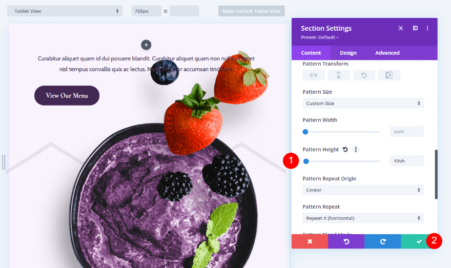 Next, we need to make the background work well with different screen sizes. We’ll need to adjust the Pattern Height based on the screen size. Scroll back up to the Background settings and select the Tablet icon.