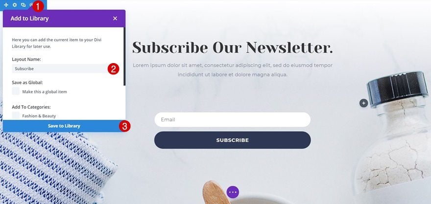 Then, save both the hero section and the subscribe section to your Divi Library by clicking on the icon marked in the print screen below, giving your layout a name and clicking on the ‘Save to Library’ button.