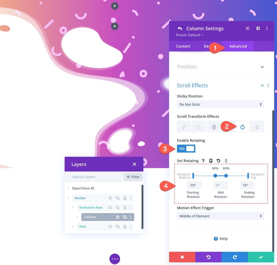 Go to the Advanced tab. Under the scroll effects options, select the Rotating tab and update the following: