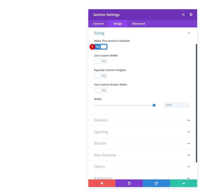 Without adding any modules or row, open the section settings and enable the โMake This Section Fullwidthโ option in the sizing settings.