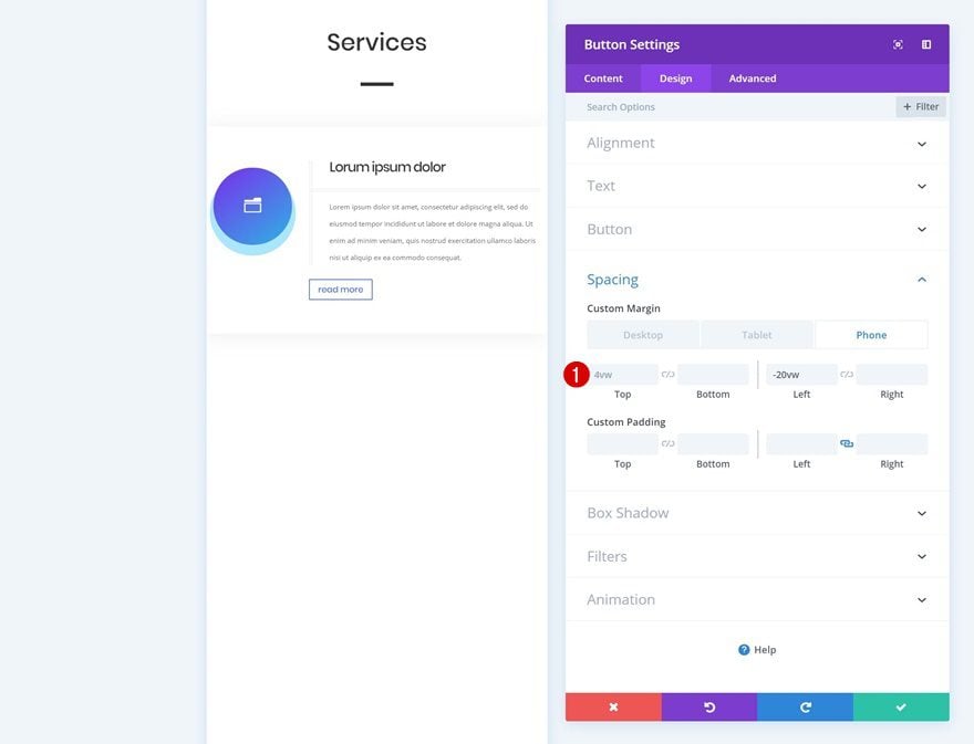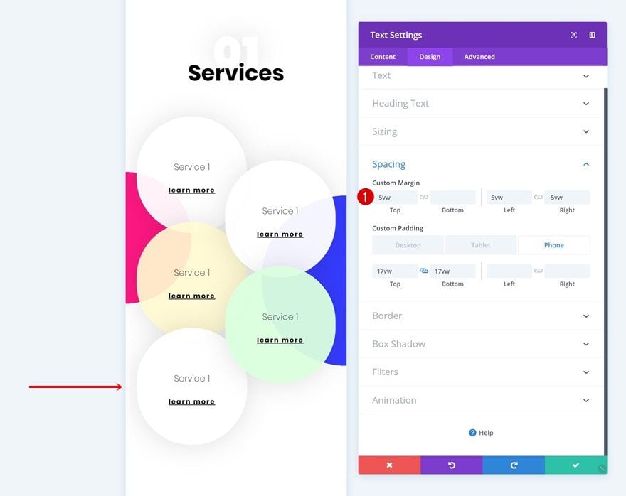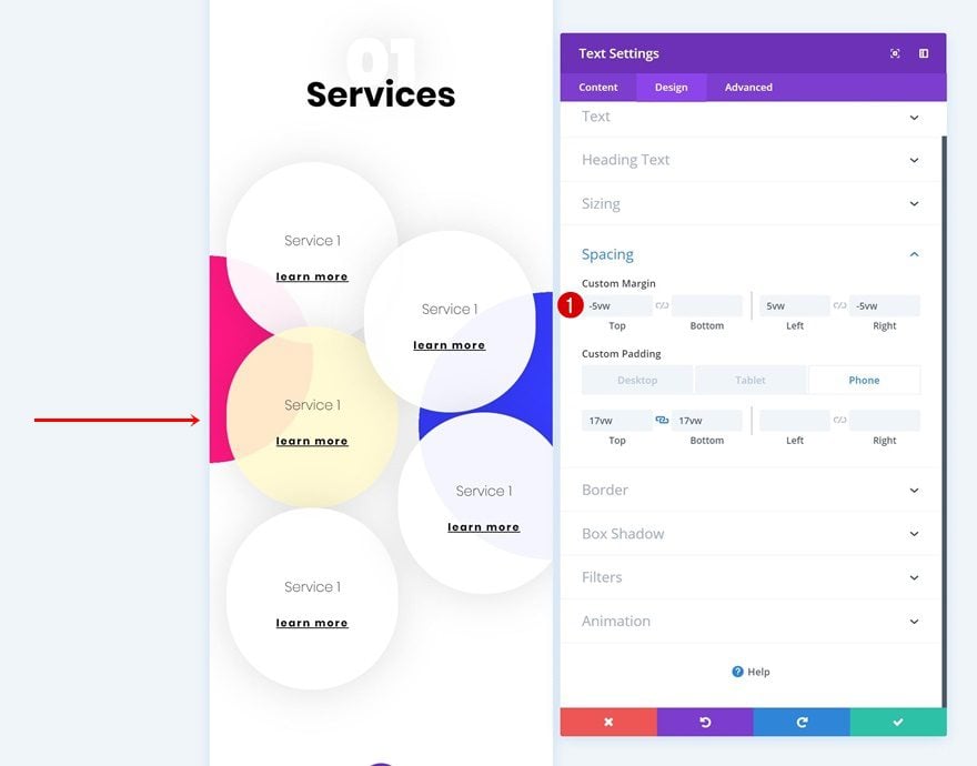 To create a shape out of this module, weโre going to add some custom margin and padding values in the spacing settings.