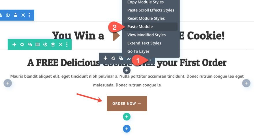 To add the content of our CTA, we are going to copy a text module from the premade layout on the page. Find and copy the text module with the title βShop Onlineβ.