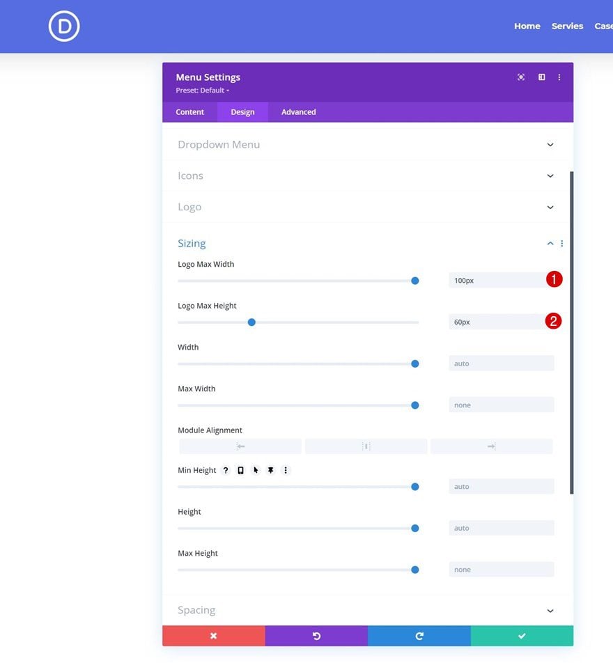 Move on to the moduleβs design tab and apply some logo max width and height. These values will help us keep the size of our static and sticky logo the same.