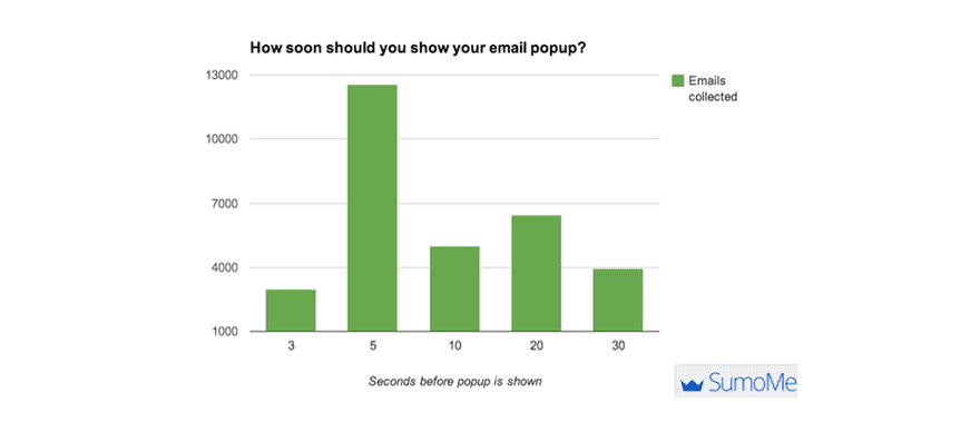 In a post that shares tips and tricks on how AppSumo collected over 100,000 emails, the following results got shared regarding the pop-up delay time: