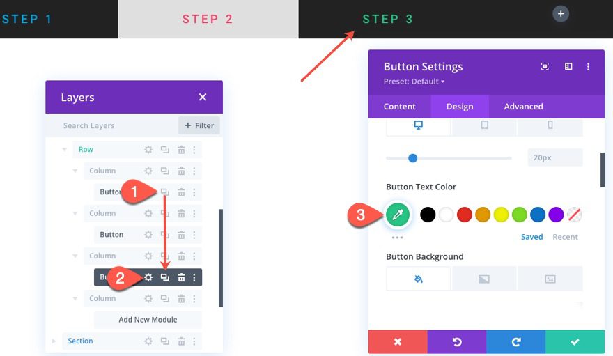 To create the step 3 button, duplicate the step 1 button (it has the same bg color), and drag it into column 3.