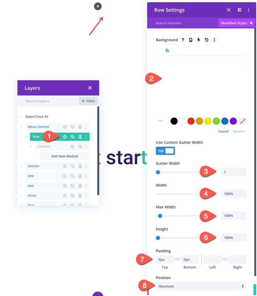 This next part is where we finally create the scroll progress bar with our menu buttons. The idea is to add a fixed section to the top of the page. Then inside the section, weโll create a row that holds a divider module that will serve as our progress bar indicator. On top of the row with the progress bar, we are going to add another row that will contain our buttons. Each button will have a transparent (or semi-transparent) background in order to reveal the progress bar behind it as the user scrolls down the page.