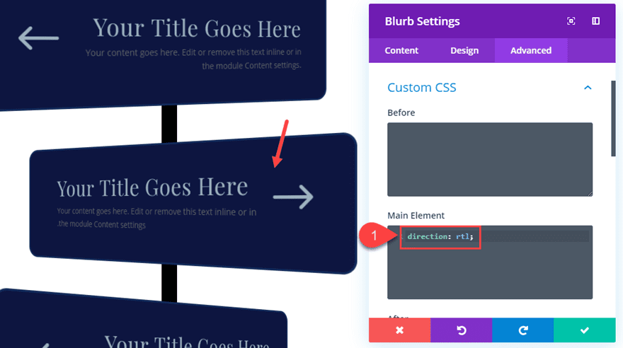 Right now all of the arrows are pointing in the same direction. To change the direction from left to right, we need to update the blurb module settings a bit.