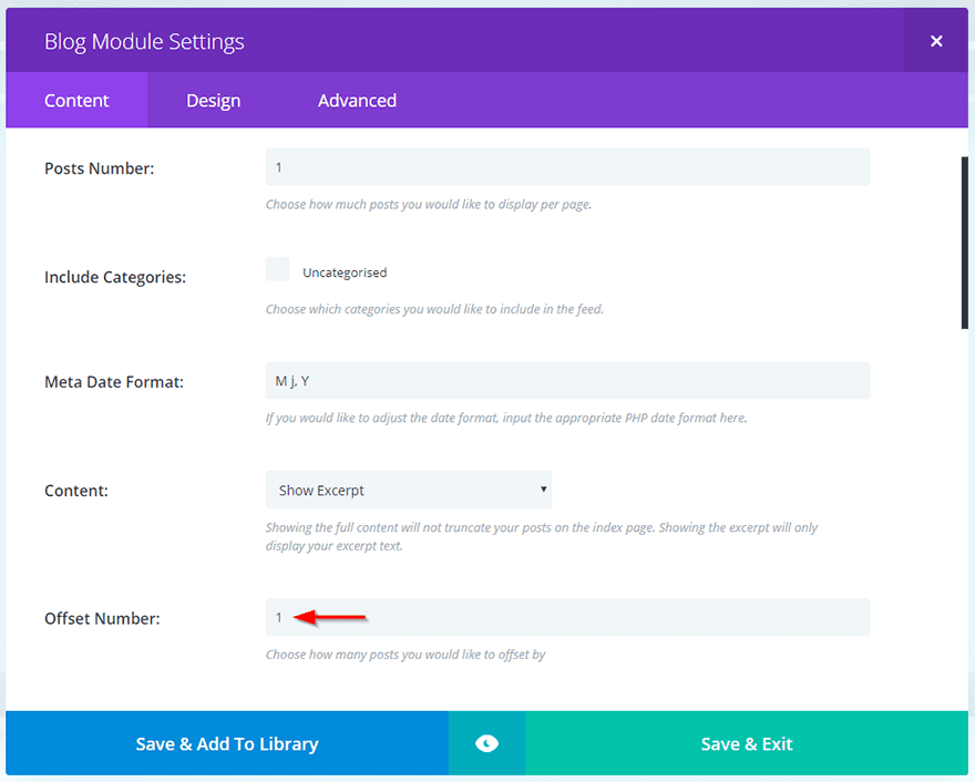 For this first module, we need the Posts Number set to 1, and the Offset Number set to 0.