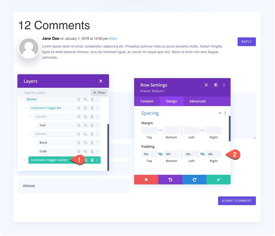 First, you can add the label, “Comments Toggle Content”, to the row. Then open the row settings and update the padding as follows: