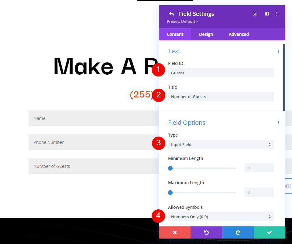 Add another Field, change the Field ID to Guests, the Title to Number of Guests, and use Input Field as the Type. For Allowed Symbols, select Numbers Only. Close the submodule.